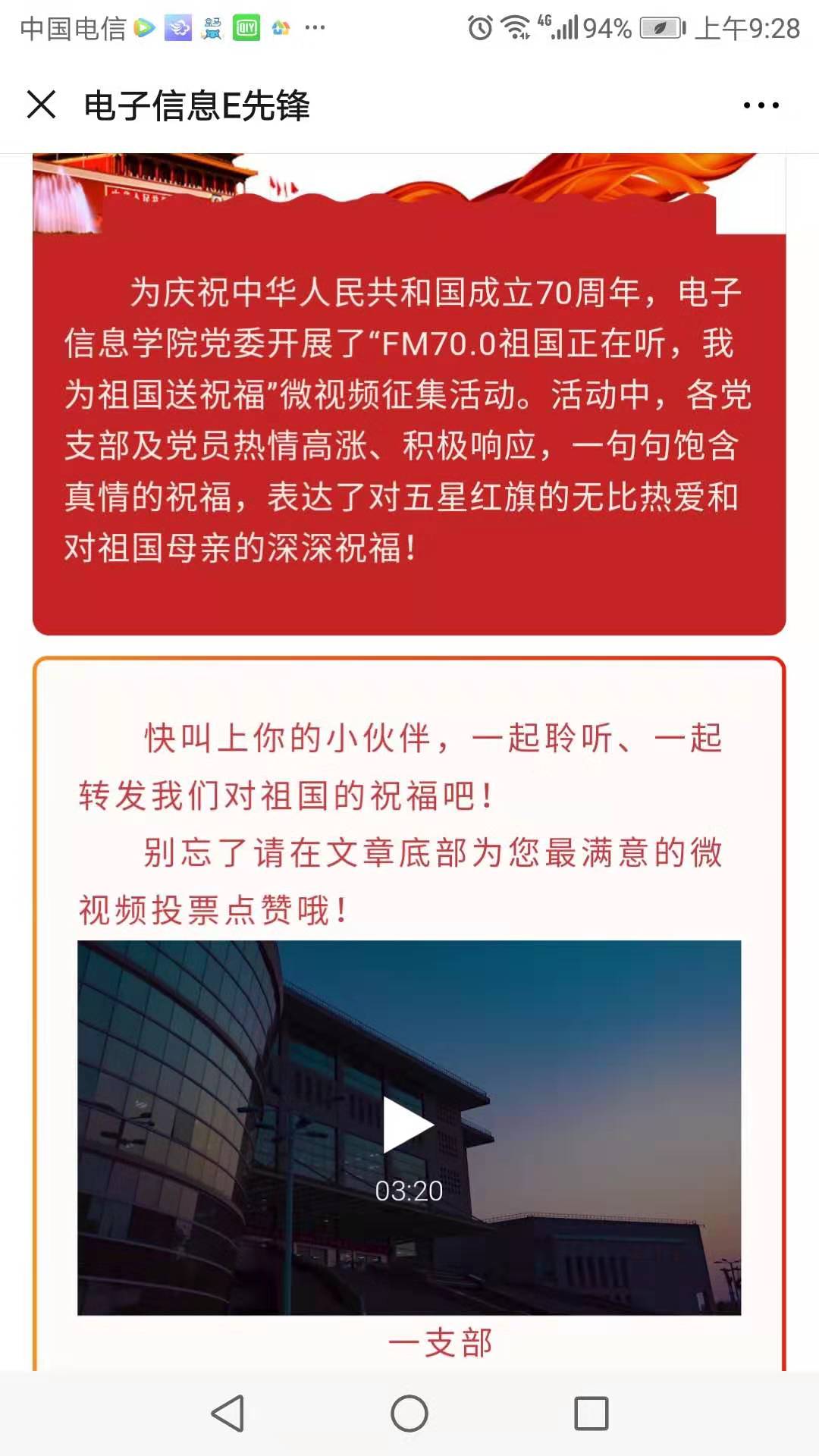 国庆七天,通过电子信息E先锋微信平台开展“FM70.0 祖国正在听:我为祖国送祝福”微视频推送活动,组织学院党支部和党员通过视频短片的形式,为祖国七十周年华诞献上祝福。