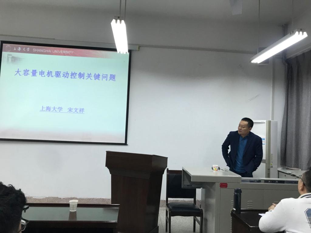 宋文祥教授做了题为《大容量电机驱动控制关键问题》的主题学术报告。报告以城市轻轨电车牵引控制的关键问题为切入点,着重阐述了电机磁链观测及离散化、弱磁控制、低速回馈运行稳定性,以及采用优化脉冲模式的低开关频率高性能电机驱动控制方案。讲座结束后,宋文祥教授与参会老师、同学们就电机驱动控制技术、大功率电力电子技术进行了学术讨论,并对科研中的困惑进行了指点。