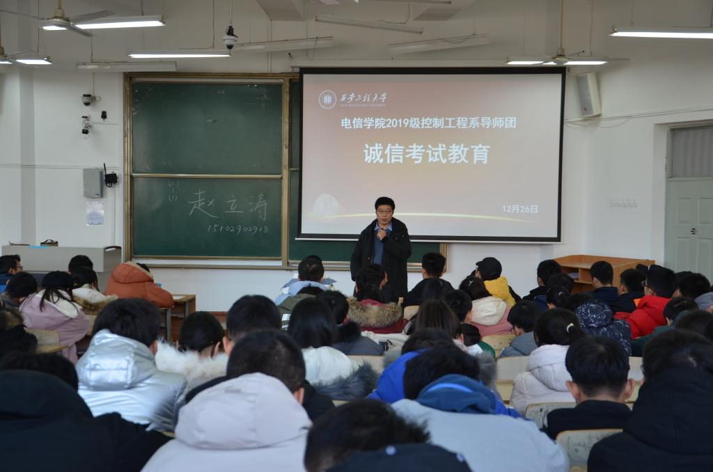 为严肃考风考纪,提高学生的诚信意识,进一步加强学院学风养成。jxf吉祥网手机在线于12月26日在教学楼B135召开2019级控制系导师团召开考试诚信教育大会。会议由赵立涛老师主持,2019级控制系全体学生163人聆听会议内容。