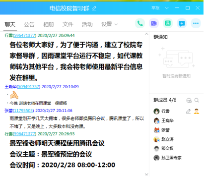 除课前必备动作之外,电信学院采取“1+1”的多重预案方式,即每门课建立1个师生课程教学群,用于通知事项和解答学生学习过程的各类疑问;每门课额外准备1个备用在线教学平台。除指定的雨课堂教学平台之外,任课老师额外学习准备另外一个备用在线教学平台,避免指定平台因网络不好无法进入而影响课程进度,确保教学正常开展。
