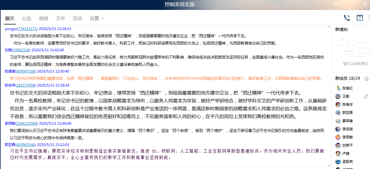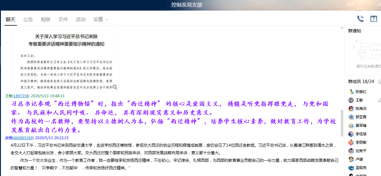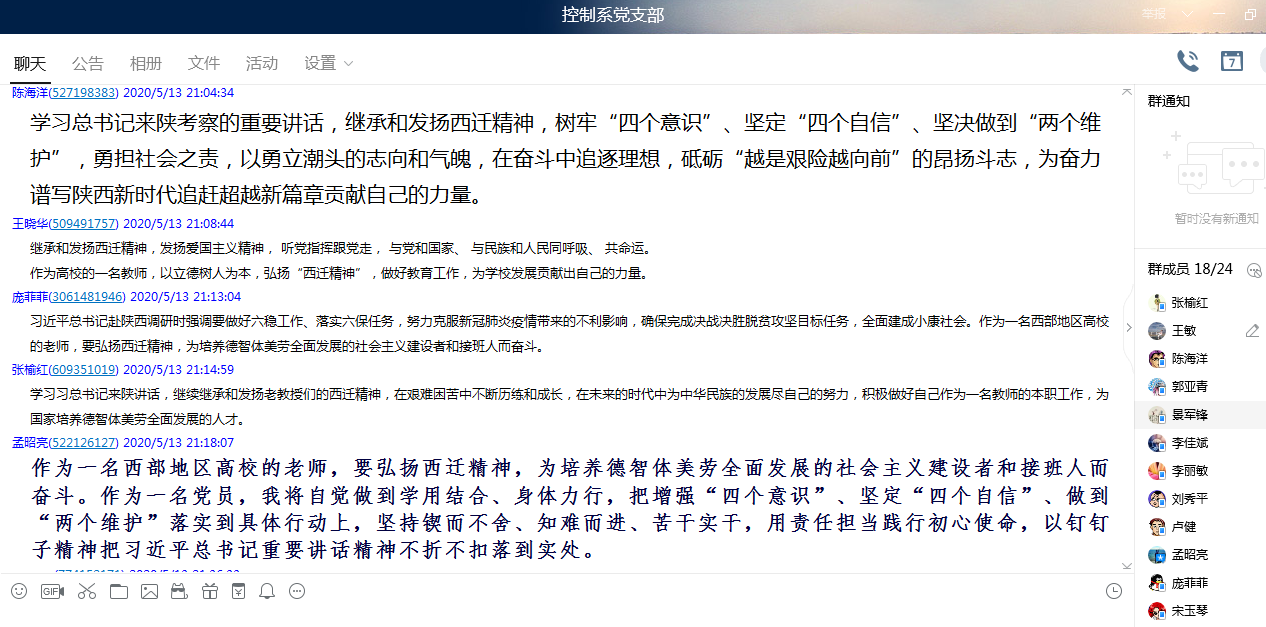 5月13日晚7点,全国样板党支部jxf吉祥网手机在线控制系党支部在支部QQ群线上开展了“习近平总书记来陕视察重要讲话重要指示精神”专题学习会。会议由支部副书记王敏主持,控制系全体党员都参与了学习,并发表学习感言。