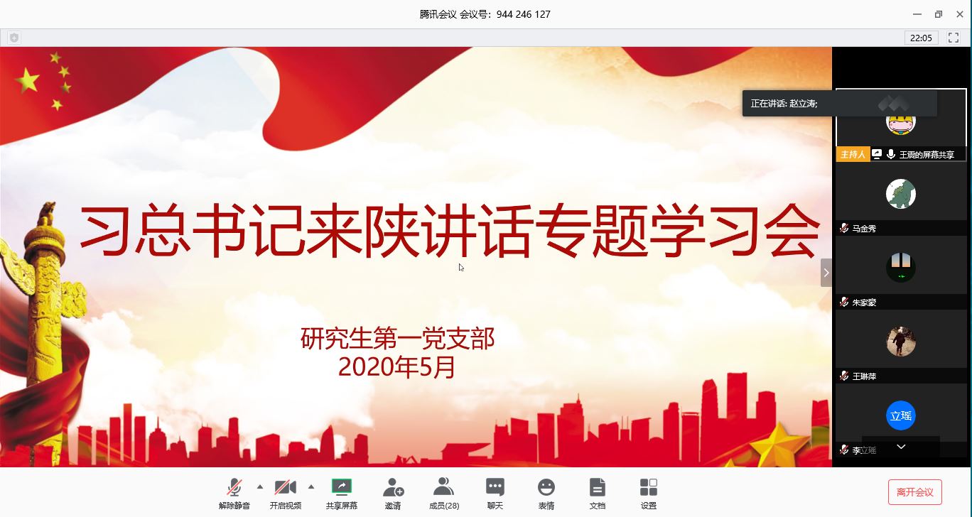 为深入学习贯彻习近平总书记来陕考察重要讲话精神,jxf吉祥网手机在线研究生第一党支部于2020年5月24日开展了“习近平总书记来陕考察重要讲话精神”专题学习会,会议由支部书记赵立涛老师主持,支部全体党员参加此次会议。