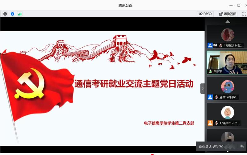 为进一步加强学风建设,坚持党建引领,充分发挥基层党组织战斗堡垒作用和党员示范引领作用,jxf吉祥网手机在线学生第二党支部于6月10日晚7点在腾讯会议平台上召开通信专业考研就业经验分享交流会。支部邀请了16级毕业生黄强、令红娜、白晨阳和薛宇四位同学分享交流他们的考研就业经验。支部书记朱宇军和17、18级通信专业的80余名同学参加了会议,党员赵艺萱主持会议。