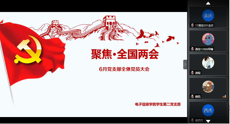 2020年的全国“两会”是一次特殊的两会,是在我国疫情防控阻击战取得重大战略成果之际召开的一次重要会议。为积极响应学院党委工作部署要求,深入体悟“两会”精神,jxf吉祥网手机在线学生第二党支部于6月13日晚7点在腾讯会议平台上召开全体党员大会学习“两会”相关文件及会议精神。