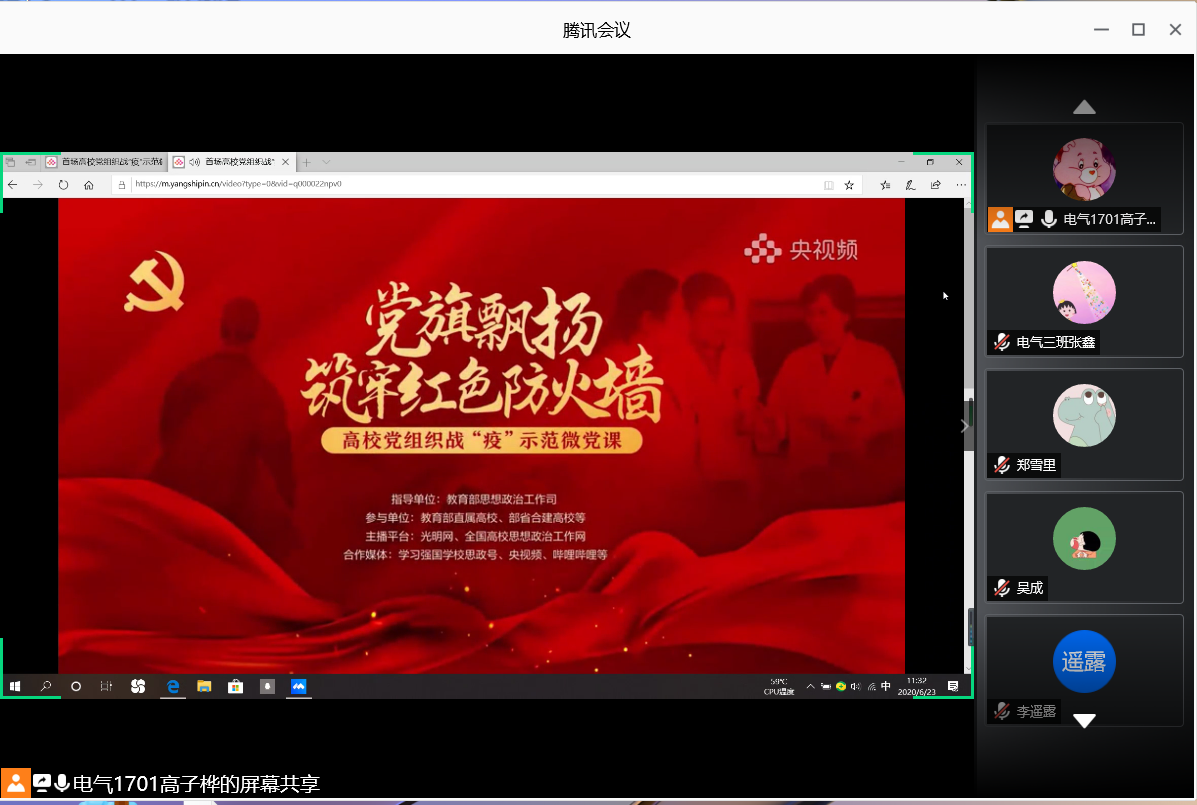 为贯彻落实党中央关于常态化疫情防控的决策部署,充分发挥基层党组织战斗堡垒作用和学生党员先锋模范作用,2020年6月23日,jxf吉祥网手机在线学生第四党支部通过腾讯会议,组织32名党员集体上“高校党组织战疫示范微党课”第一讲(以下简称“微党课”)。本次线上上党课由支部书记刘风萍主持。