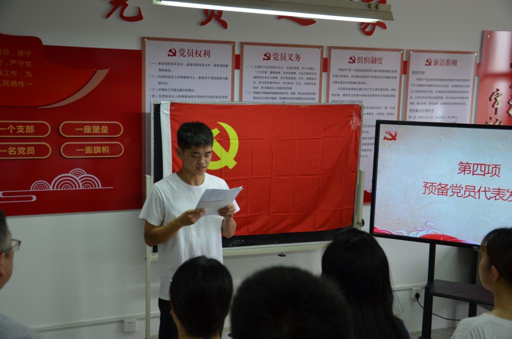 宣誓完毕后,新党员郑雪里同学代表本次宣誓的预备党员作了表态发言,他表示大家要恪守在党旗下的诺言,要严格要求自己,时刻保持共产党员的先进性和先锋模范作用。今后要认真学习习近平新时代中国特色社会主义思想,坚定政治信仰,加强组织观念,提高自身修养,积极履行党员的责任和义务,做一名新时代合格党员。