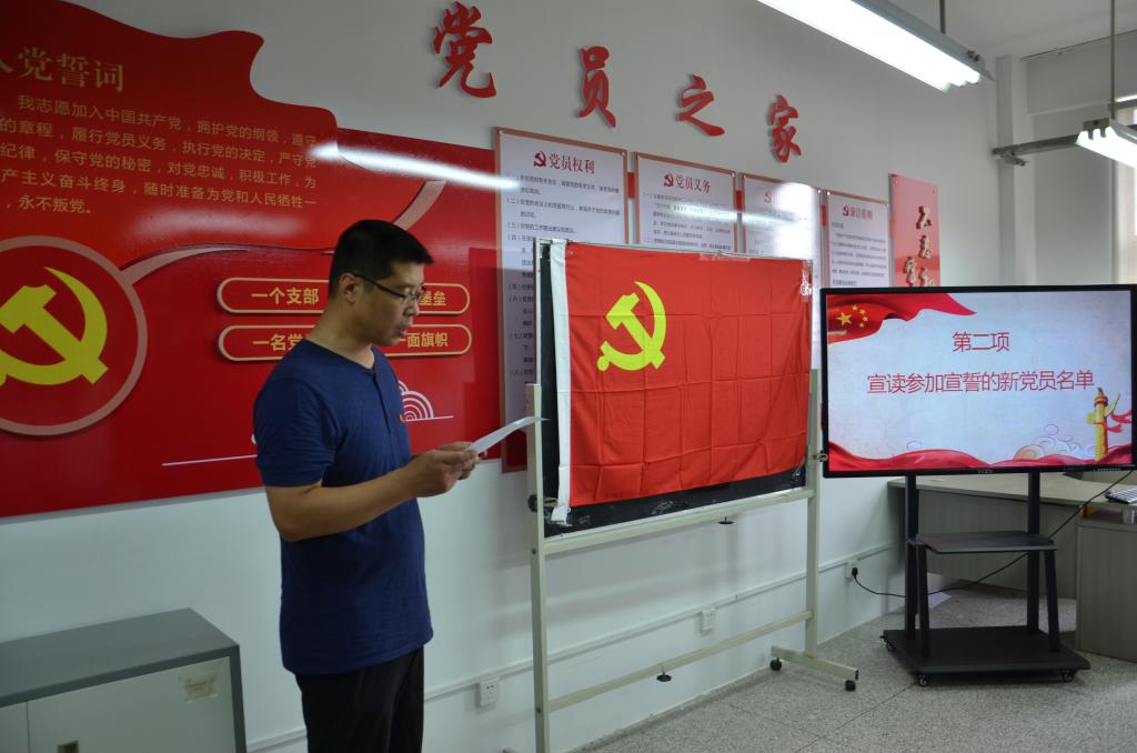 宣誓仪式在雄壮的《国际歌》声中拉开序幕。首先由研究生第一党支部书记赵立涛宣读了参加宣誓的新党员名单,接着全体预备党员在杨恩科书记的领誓下,面对鲜红的党旗,庄严宣誓,拷问初心,坚定信念。