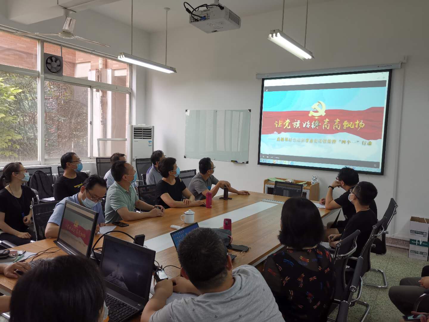 在中国共产党99岁生日当天,2020年7月1日下午2点,电气系党支部全体教工在临潼电信楼102教研室同上云端微党课“党旗飘扬,筑牢红色防火墙”—— “七一”专题高校党组织战“疫”示范微党课。