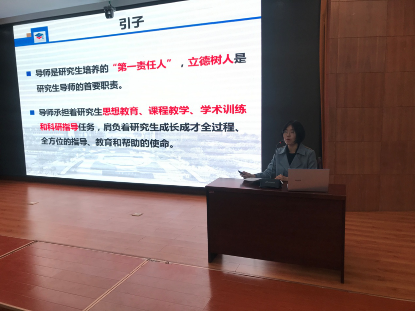 随后,学生科李璐瑶老师做了主题为《研究生思想政治教育管理中导师的职责》的报告。她回溯了我校研究生工作的发展历程和基本概况,介绍了我校研究生教育工作的基本做法,进一步解读了教育部下发的《研究生导师指导行为准则》、《研究生导师立德树人七项职责》,分享了自己在研究生教育过程中的做法和经验。