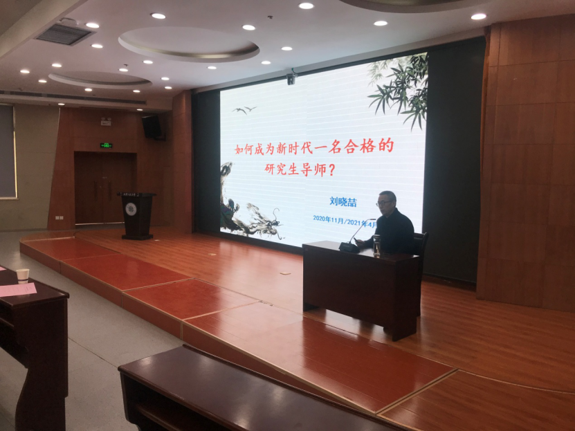 首先,研究生院刘晓喆院长带来了主题为《如何成为新时代一名合格的研究生导师》的专题报告。刘院长从全国研究生教育会议新精神、导师职责的新变化、如何成为一名合格的研究生导师三个方面展开论述。刘院长指出,导师要肩负学生就业向导、学业向导、人生向导的责任,做一个合格的研究生导师既要当学生学业上的引路人,又要做学生生活中的监管者和把关人,希望各位导师明确个人职责,扎实履行好教书育人的责任,把学校和学院的各项要求落实到研究生各个培养环节中,以学术涵养去引领学生,以真心真情去关怀学生。