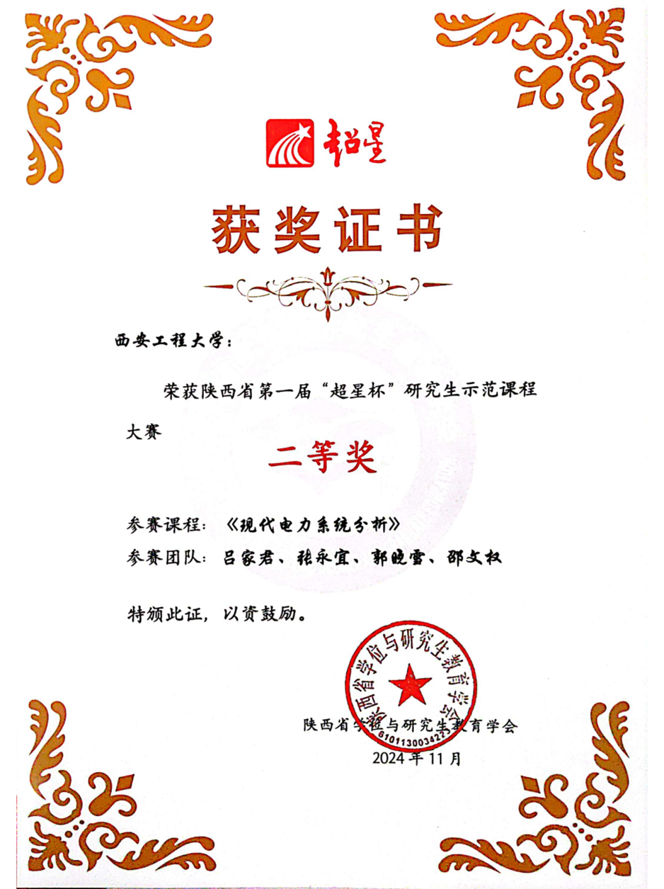 我院吕家君老师团队的现代电力系统分析课程,在陕西省第一届“超星杯”研究生示范课程大赛上荣获二等奖,西安工程大学荣获大赛优秀组织奖。